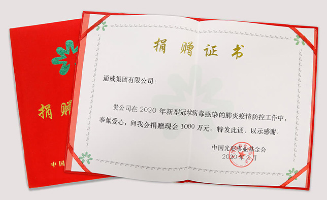 2020年1月29日,通威集團第一時間捐贈1000萬元馳援武漢及周邊疫區前線抗擊疫情及相關防治工作