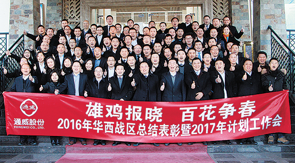 通威股份郭異忠總裁與參會人員合影留念通威股份副總裁兼華西戰區總裁宋剛杰在大會上致辭,宋總首先感謝了大家一年來的辛勤工作。宋總表示,華西戰區在總部六五規劃開局之年,人事變革的大環境下,量利排名依然取得了不錯的成績,這離不開華西戰區在座各位領導班子的有效經營,但是同時我們也要看到華西戰區的小微公司占據了股份半壁江山,需要合理規劃,精耕市場,爭取早日脫貧。宋總分析了華西戰區的銷售情況并作具體工作安排,圍繞數據指標分解任務;做好經營預算試點工作;挑戰持續挑戰,不破不立;思考好小微公司的處境,積極借鑒“村淘”工作的開展與途徑。宋總強調,一切工作圍繞養殖戶利益最大化,經銷商利潤合理化,員工的福利最大化,管理層要加大對員工的關注;整合資源,積極探索新的合作模式、資源整合模式;嚴格市場管理價格鎖定,明確市場;提升產品結構,加強創新;開展組織框架調整,助推人均銷量大幅提升。