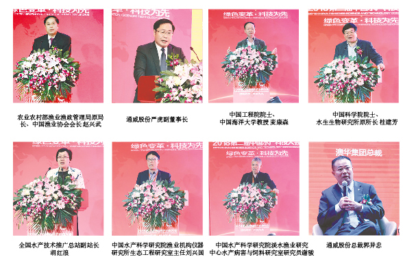 作為一場(chǎng)覆蓋育種、養(yǎng)殖、流通、加工等水產(chǎn)行業(yè)全產(chǎn)業(yè)鏈的科技盛宴,本次大會(huì)匯聚了來(lái)自國(guó)內(nèi)外水產(chǎn)行業(yè)的頂級(jí)嘉賓陣容,農(nóng)業(yè)農(nóng)村部漁業(yè)漁政管理局原局長(zhǎng)、中國(guó)漁業(yè)協(xié)會(huì)會(huì)長(zhǎng)趙興武,中國(guó)工程院院士、中國(guó)海洋大學(xué)教授麥康森,中國(guó)科學(xué)院院士、水生生物研究所原所長(zhǎng)桂建芳,中國(guó)水產(chǎn)科學(xué)研究院副院長(zhǎng)鄧偉,全國(guó)水產(chǎn)技術(shù)推廣總站、中國(guó)水產(chǎn)學(xué)會(huì)副站長(zhǎng)胡紅浪,四川省水產(chǎn)局局長(zhǎng)趙勇,四川省水產(chǎn)技術(shù)推廣總站站長(zhǎng)鄧紅兵,中國(guó)水產(chǎn)科學(xué)研究院漁業(yè)機(jī)械儀器研究所生態(tài)工程研究室主任劉興國(guó),中國(guó)水產(chǎn)科學(xué)研究院淡水漁業(yè)研究中心水產(chǎn)病害與飼料研究室研究員謝駿,江蘇中洋集團(tuán)董事長(zhǎng)錢曉明,通威股份嚴(yán)虎副董事長(zhǎng),通威股份郭異忠總裁,通威集團(tuán)副總裁黃其剛,英國(guó)BENCHMARK控股有限公司董事、比利時(shí)INVE英偉水產(chǎn)集團(tuán)全球總裁Philippe Leger,丹麥拜歐瑪BioMar集團(tuán)副總裁Henrik,澳華集團(tuán)總裁許愿斌,中國(guó)漁業(yè)報(bào)總編輯汪文等嘉賓悉數(shù)出席。