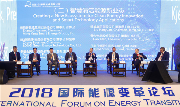 當天下午,以“營造智慧清潔能源的創(chuàng)新應用新生態(tài)”為主題、由國家應對氣候變化戰(zhàn)略研究和國際合作中心首任主任李俊峰主持的對話環(huán)節(jié)成為關注焦點,通威集團董事局劉漢元主席、朝陽智慧能源集團股份有限公司董事長張傳衛(wèi)、隆基綠能科技股份有限公司董事長鐘寶申、常州天合光能有限公司董事長高紀凡、丹麥丹佛斯中國區(qū)總裁Kjeld Stark等行業(yè)領軍企業(yè)家同臺交流,精彩對話。