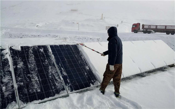 志愿者為光伏發(fā)電系統(tǒng)掃雪