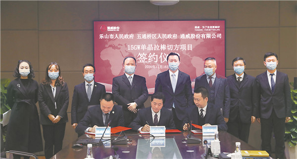 2020年12月16日,通威股份15GW單晶拉棒切方項(xiàng)目簽約儀式在成都通威國際中心成功舉行。通威股份與樂山市人民政府、五通橋區(qū)人民政府正式簽訂《通威股份15GW單晶拉棒切方項(xiàng)目》協(xié)議。樂山市委副書記、市長張彤,十一屆全國政協(xié)常委、全國人大代表、通威集團(tuán)董事局劉漢元主席,樂山市副市長廖克全,五通橋區(qū)委副書記、區(qū)長李良,永祥股份副總經(jīng)理袁中華,永祥硅材料副總經(jīng)理張軍等領(lǐng)導(dǎo)出席簽約儀式。