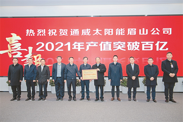 2021年,通威太陽(yáng)能眉山公司實(shí)現(xiàn)產(chǎn)值101億元,成為眉山市第一家百億企業(yè)。1月25日,通威太陽(yáng)能眉山公司成為眉山市首家百億企業(yè)授牌儀式在眉山基地展廳隆重舉行。眉山市委書(shū)記胡元坤,通威集團(tuán)董事局劉漢元主席出席授牌儀式。市委副書(shū)記、市長(zhǎng)黃河主持儀式。授牌儀式上,黃河市長(zhǎng)指出,眉山市委市政府提出“制造強(qiáng)市、開(kāi)放興市、品質(zhì)立市”,傾力打造“1+3”現(xiàn)代工業(yè)體系。通威太陽(yáng)能作為全球光伏行業(yè)領(lǐng)軍企業(yè),自2019年3月落戶眉山以來(lái),從談判、簽約到投產(chǎn),創(chuàng)造了“通威速度、眉山速度”。從2020年4月投產(chǎn)至今,不到兩年的時(shí)間,2021年便實(shí)現(xiàn)了產(chǎn)值超100億元,再次創(chuàng)造了“通威速度”,成為全市首個(gè)產(chǎn)值突破百億的企業(yè)。我們向漢元主席及漢元主席領(lǐng)導(dǎo)的通威集團(tuán)表示熱烈的祝賀,并對(duì)通威太陽(yáng)能在眉山工業(yè)經(jīng)濟(jì)發(fā)展中作出的貢獻(xiàn)表示衷心的感謝。