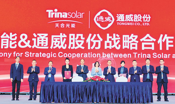 大會(huì)上,《2023中國(guó)與全球光伏發(fā)展白皮書(shū)》、《2023中國(guó)光伏百?gòu)?qiáng)品牌榜》全球隆重發(fā)布;《通威特色“光伏+”模式:漁光一體產(chǎn)業(yè)園》、《每人一千瓦2022報(bào)告》等各類(lèi)報(bào)告發(fā)布;發(fā)出《硅能源產(chǎn)業(yè)高質(zhì)量協(xié)同發(fā)展倡議》《光伏柔性產(chǎn)業(yè)聯(lián)盟倡議》等倡議書(shū);首個(gè)中國(guó)光伏節(jié)正式設(shè)立、四川省川聯(lián)光伏產(chǎn)業(yè)商會(huì)成立、晶硅光伏行業(yè)產(chǎn)教融合共同體成立;通威TNC組件G12R系列產(chǎn)品正式亮相;通威太陽(yáng)能十年新書(shū)《必然性》正式發(fā)布。
