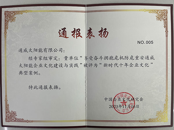本次獲獎是對通威太陽能十年企業文化建設實踐和成果的充分肯定。新時代十年是通威太陽能企業文化繁榮發展的十年,是企業文化為企業強基賦能的十年,也是通威太陽能文化自覺文化自信迅速提升的十年。未來,通威太陽能將再接再厲,努力奮斗,通過文化強企進而助力文化強國,更好建設中華民族現代文明。