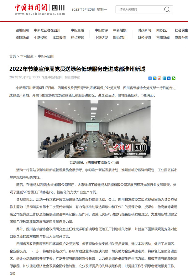 中國新聞網、四川經濟網等主流媒體聚焦通威太陽能金堂基地“2022年節能宣傳周黨員送綠色低碳服務”活動