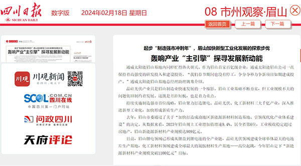 2月18日,人民網、《四川日報》發表題為《起步“制造強市沖刺年” 眉山加快新型工業化發展的探索步伐》的文章,聚焦通威太陽能眉山基地春節期間不停工、熱火朝天沖刺開門紅。