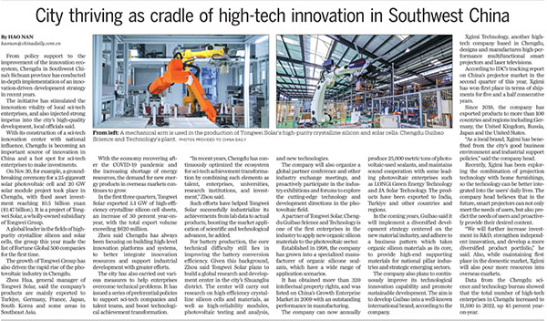近日,《中國日報》發(fā)表題為《科技創(chuàng)新助力“成都造”走向世界》的報道,并在國際版進行全球推送,聚焦通威太陽能科技創(chuàng)新與發(fā)展。