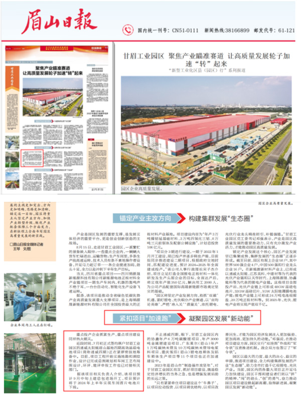 8月24日,《眉山日?qǐng)?bào)》發(fā)布一篇題為“甘眉工業(yè)園區(qū) 聚焦產(chǎn)業(yè)瞄準(zhǔn)賽道 讓高質(zhì)量發(fā)展輪子加速‘轉(zhuǎn)’起來(lái) ”的系列報(bào)道,聚焦通威太陽(yáng)能眉山基地四期項(xiàng)目建設(shè)有序推進(jìn)。