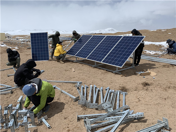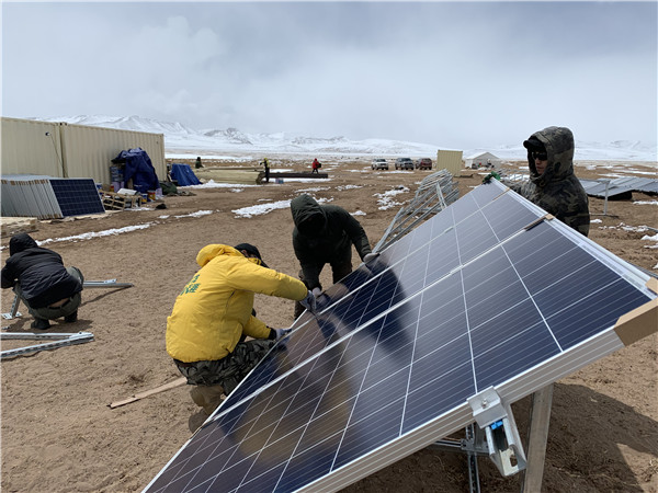 為了順利推進高海拔下的建設(shè)工作,通威新能源負責本次項目建設(shè)的工程師3月25日就抵達了格爾木,為安裝光伏系統(tǒng)作好全面準備;26日,光伏組件從通威太陽能(合肥)有限公司成功發(fā)車;31日,參與項目建設(shè)的工程師及志愿者率先抵達班德湖野生動物觀測站,對現(xiàn)場施工情況進行勘察。然而,由于高原地區(qū)持續(xù)大雪,進入營地的道路連續(xù)三天封閉,本次捐贈的光伏系統(tǒng)被堵在半路,導(dǎo)致安裝工作延遲。在組件抵達班德湖觀測站后,建設(shè)人員迅速行動、爭分奪秒,不顧缺氧和當?shù)氐膰篮畾夂颍瑑H用1天時間就完成班德湖野生動物觀測站光伏發(fā)電系統(tǒng)的全部安裝調(diào)試工作,保證了觀測站的建設(shè)進度。