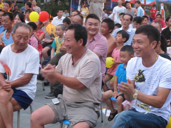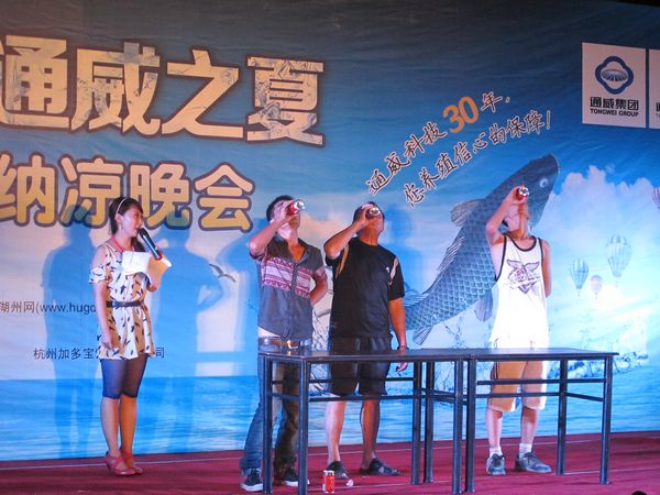 在納涼晚會保留節目加多寶互動游戲、有獎競答中迎來了村民的陣陣掌聲、喝彩聲。在和加多寶比賽中,一位身材嬌小的金阿姨擊敗了魁梧的對手勇奪冠軍,令人刮目相看。比賽后,50歲的金阿姨高興地說:“我還能再喝一罐!”在有獎競答中,由荻港魚莊提供的禮品————一箱有機葡萄成了最大驚喜。